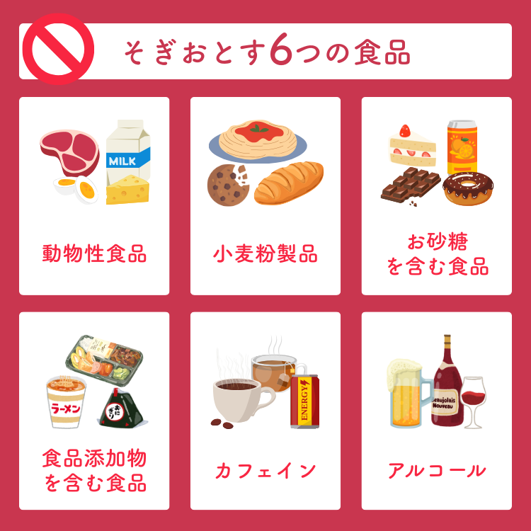 それは、動物性食品、小麦粉(グルテン)を含む食品、お砂糖を含む食品、食品添加物を含む食品、カフェイン、アルコールの6つです。以下で、さらに詳しく見ていきましょう。