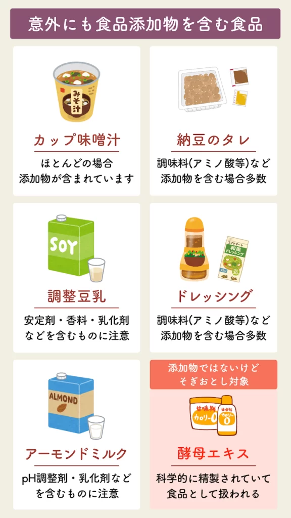 また、健康に良さそうに見える食品にも食品添加物が含まれていることが多いので、以下の食品をはじめ注意が必要です。