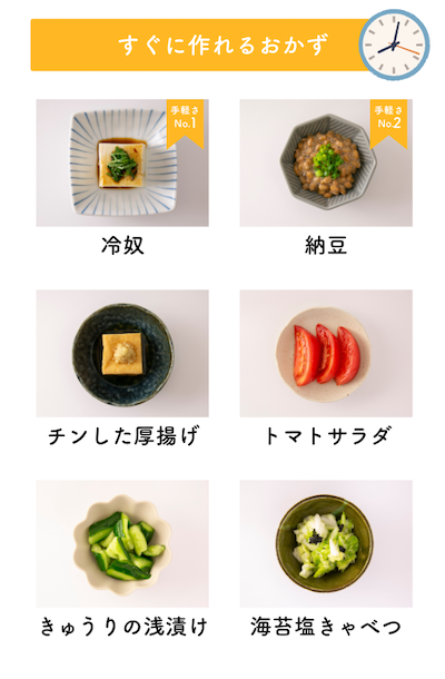 無理をして凝ったおかずにする必要はありません。買ってすぐに食べられる「お豆腐」や「納豆」でも全然大丈夫です。